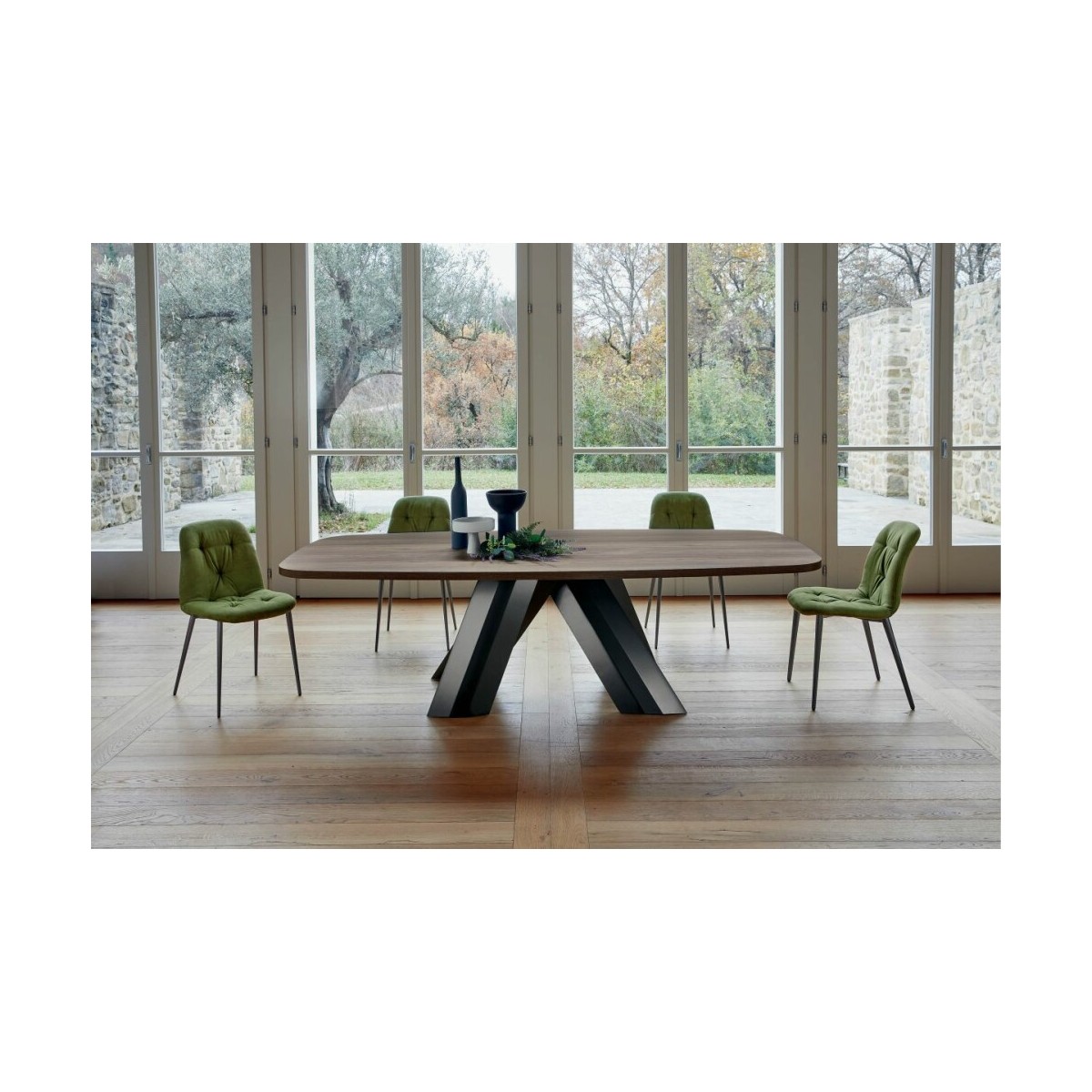 Tavolo mod. Twist a botte - Ingenia è il tavolo da pranzo dal design moderno e di forte personalità, con struttura in acciaio laccato e piano in cristallo, legno impiallacciato, melaminico e super marmo. E' possibile personalizzare al meglio Twist grazie alle svariate finiture proposte sia per la struttura che per il piano.