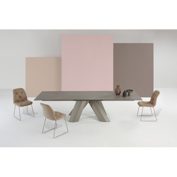 Twist è di forma rettangolare ed è disponibile in versione fissa e allungabile. Nella versione allungabile sono previste due staffe estraibili, poste sotto al piano, sulle cui guide vanno appoggiate e agganciate le allunghe: con pochi e semplici step, il tavolo aumenta di dimensioni e di stile.