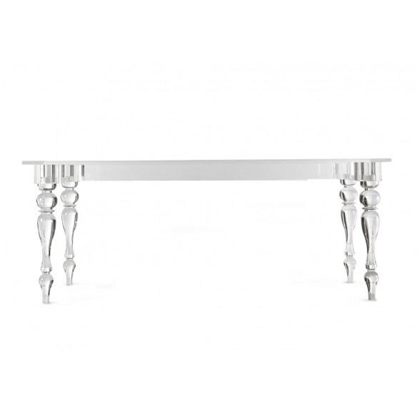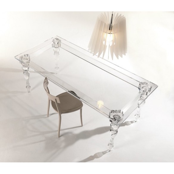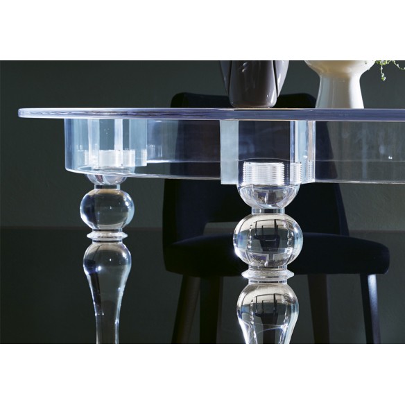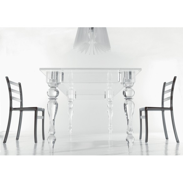 OSTE è il tavolo di Design interamente realizzato in metacrilato trasparente, le cui gambe hanno una particolare forma tornita che richiama i tavoli classici.