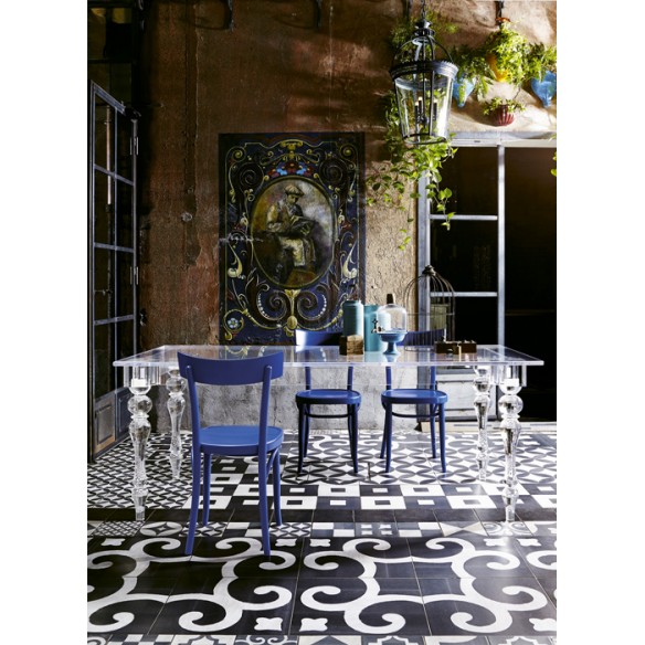 Le proporzioni e le forme evocano tavoli antichi ma il materiale modernissimo rende questo tavolo un vero oggetto di design.