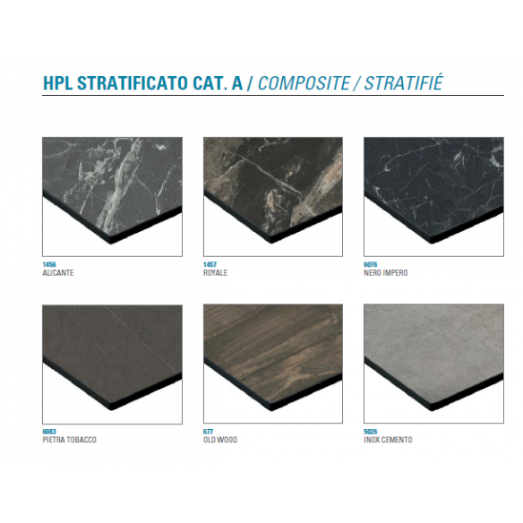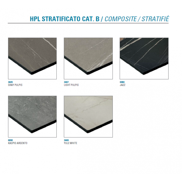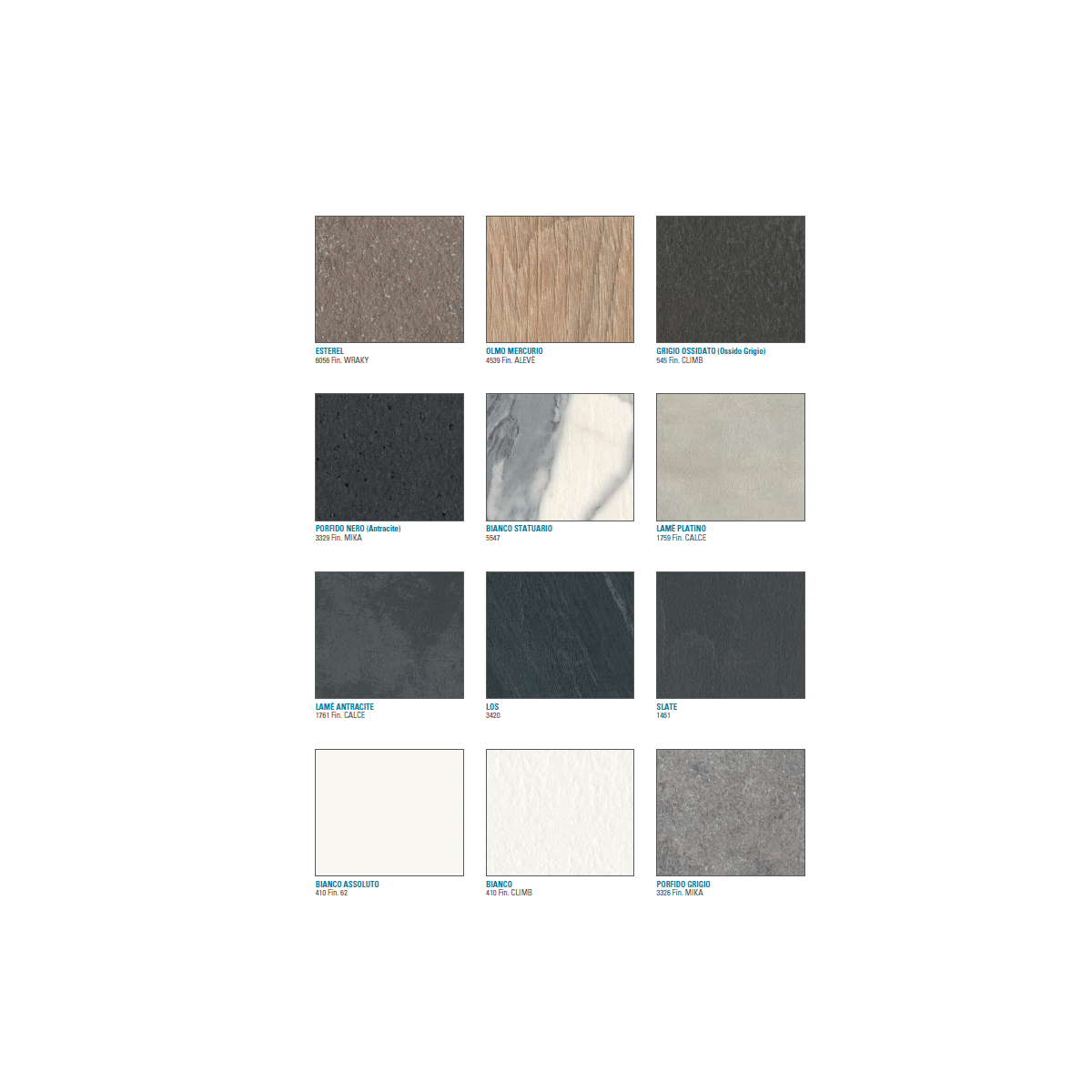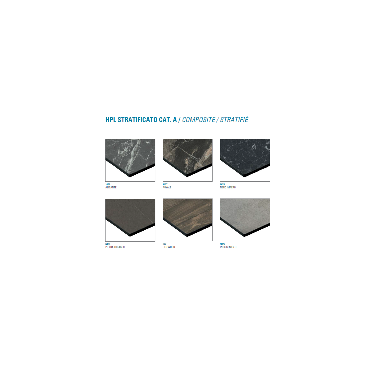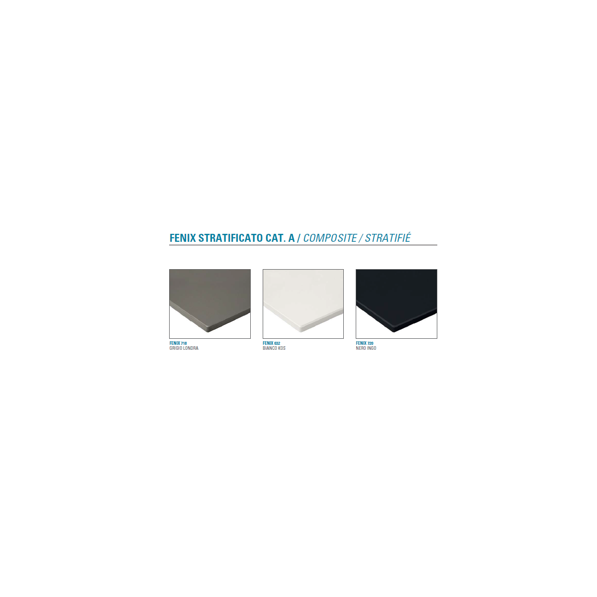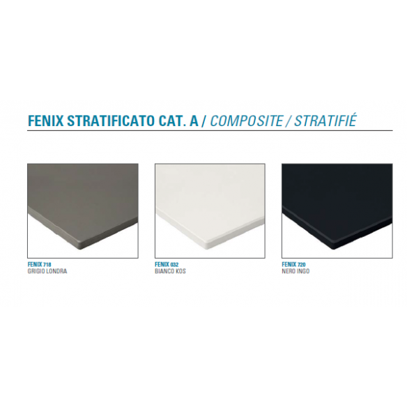 La struttura è in metallo mentre il piano è a scelta tra HPL, Fenix, Laminam o vetro. Le prolunghe sono rivestite in HPL, laminam e vetro opaco.