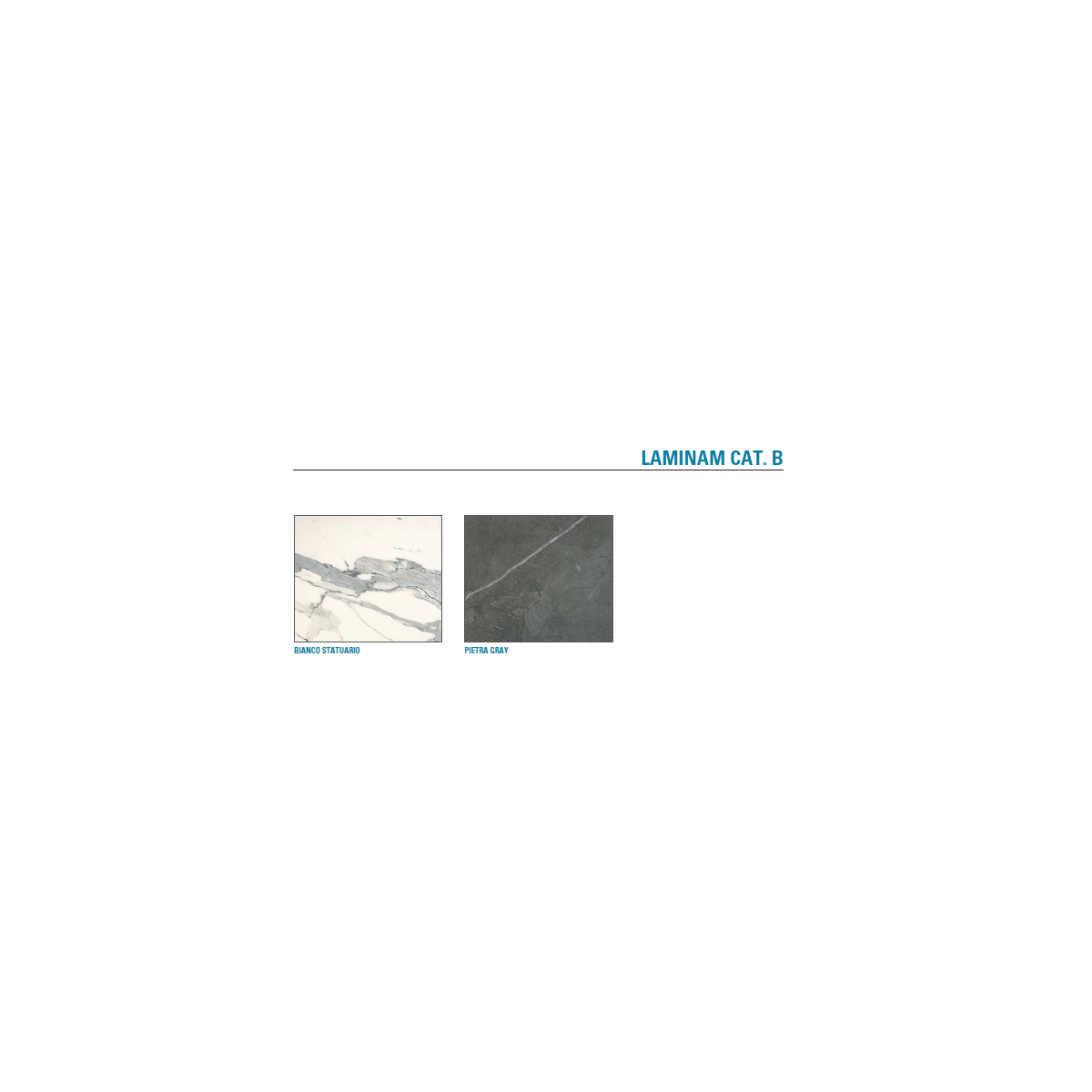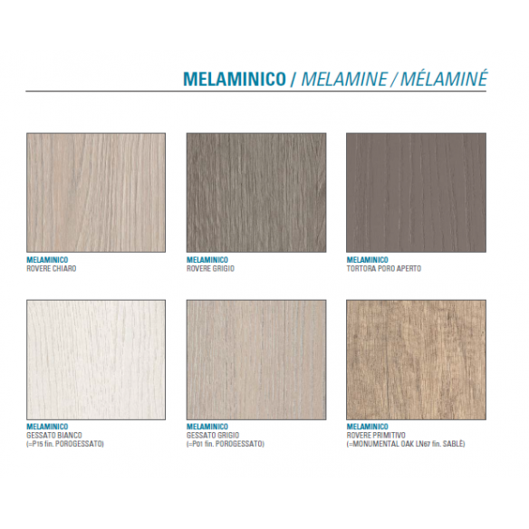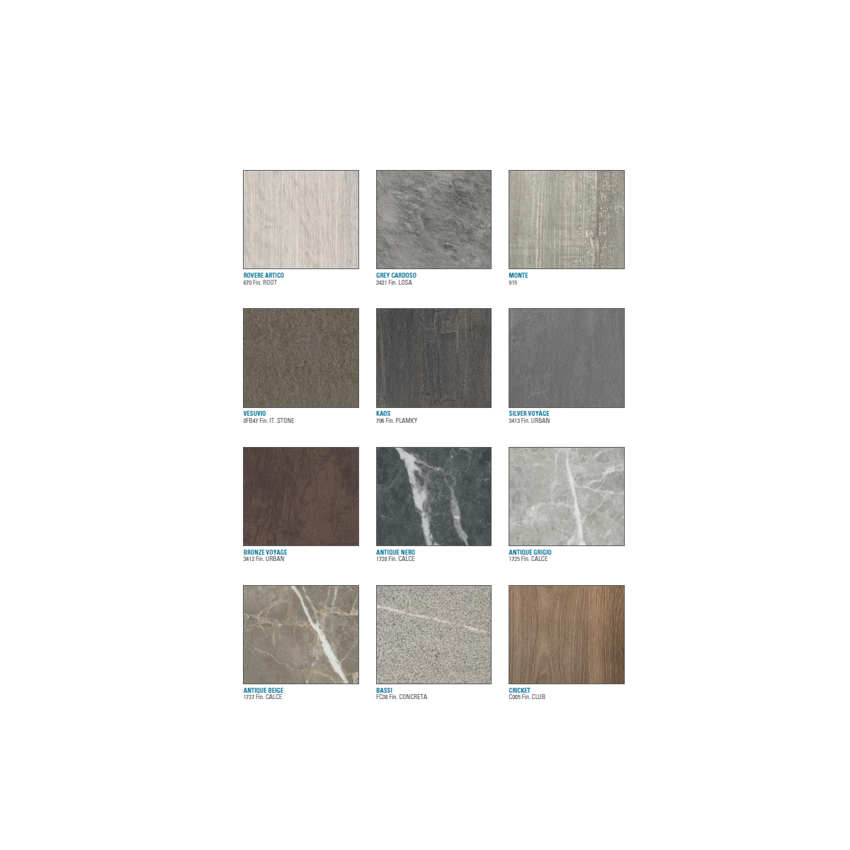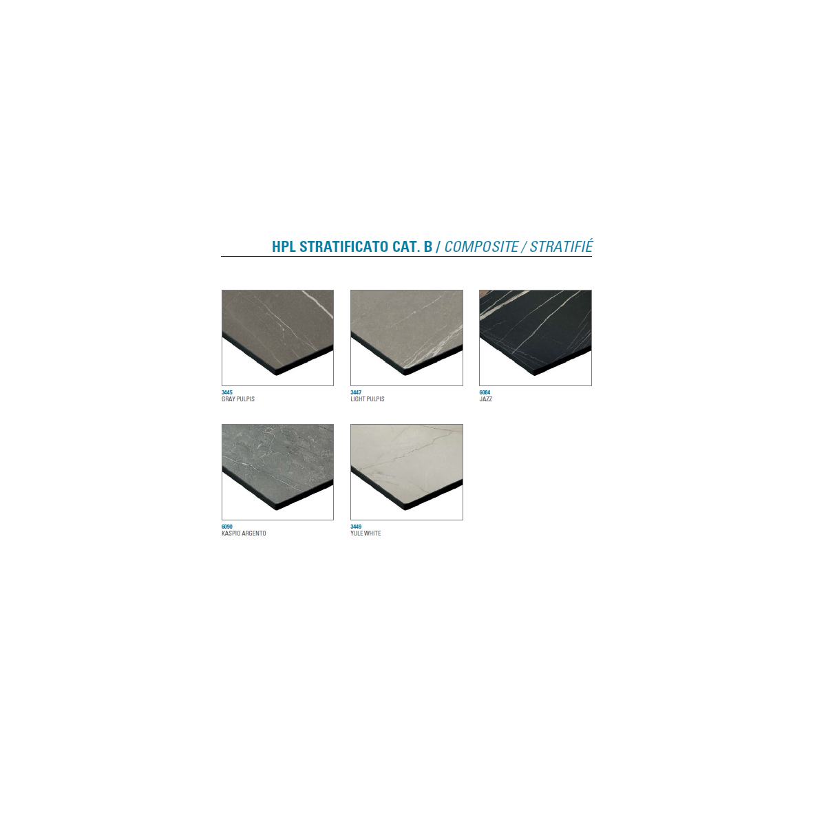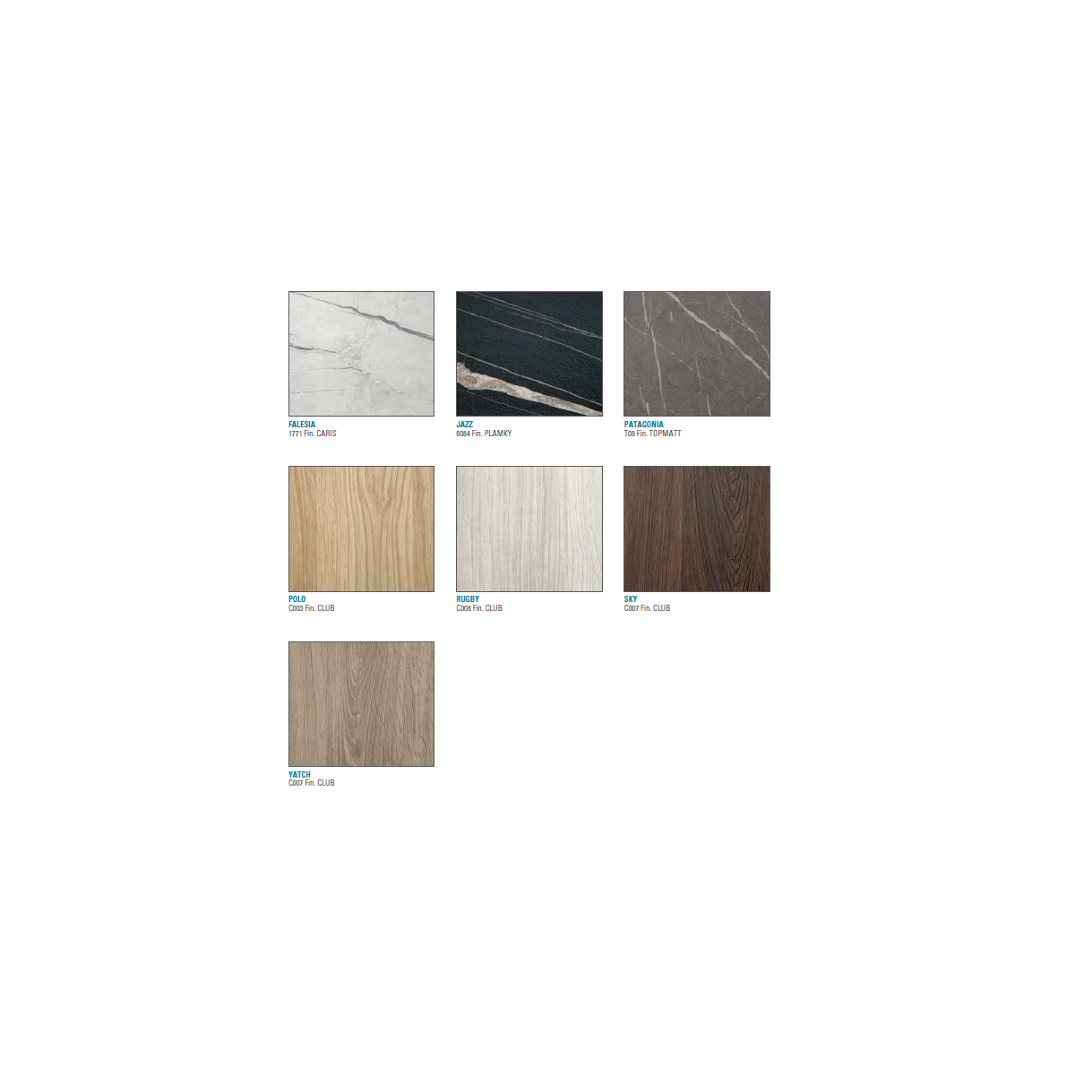 La struttura è in metallo mentre il piano è a scelta tra HPL, Fenix, Laminam o vetro. Le prolunghe sono rivestite in HPL, laminam e vetro opaco.
