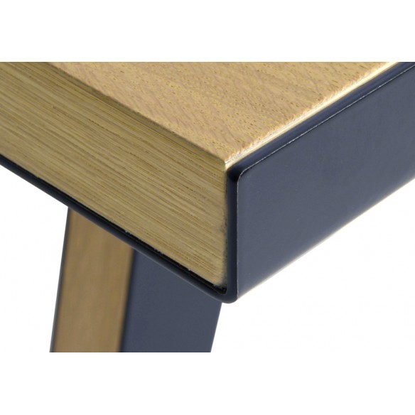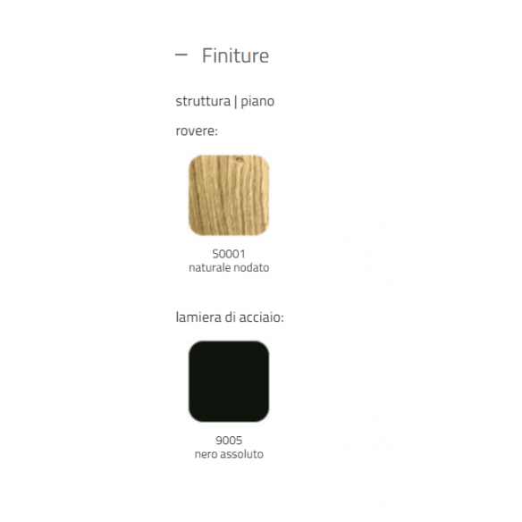 Tavolo con struttura in lamiera di acciaio nero ferro e legno di rovere naturale nodato.