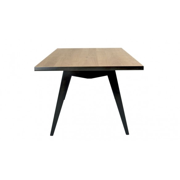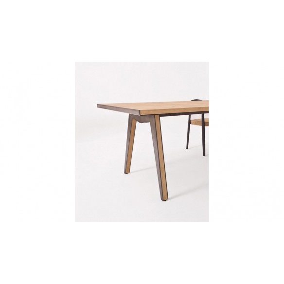 Tavolo fisso con struttura e piano in lamiera di acciaio verniciata colore nero ferro e legno in rovere nodato naturale. Tavolo Skin evoca uno stile industriale, fatto di funzione, resistenza e semplicità.
