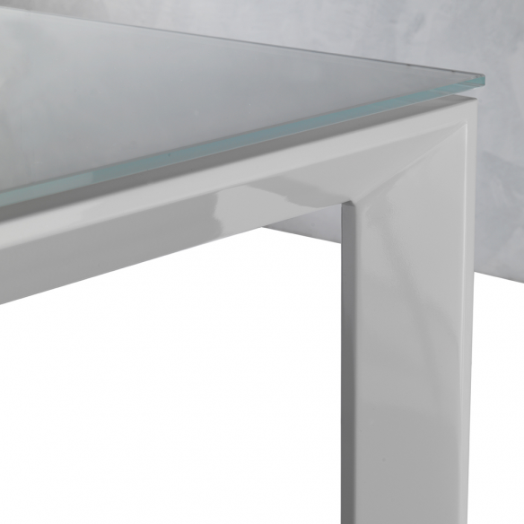 Tavolo con piano in cristallo e struttura in metallo allungabile, allunghe laccato lucido in tinta. Gambe a forma triangolare