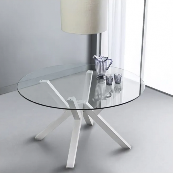 Tavolo dalla struttura in faggio massello e piano in vetro temperato12mm trasparente.